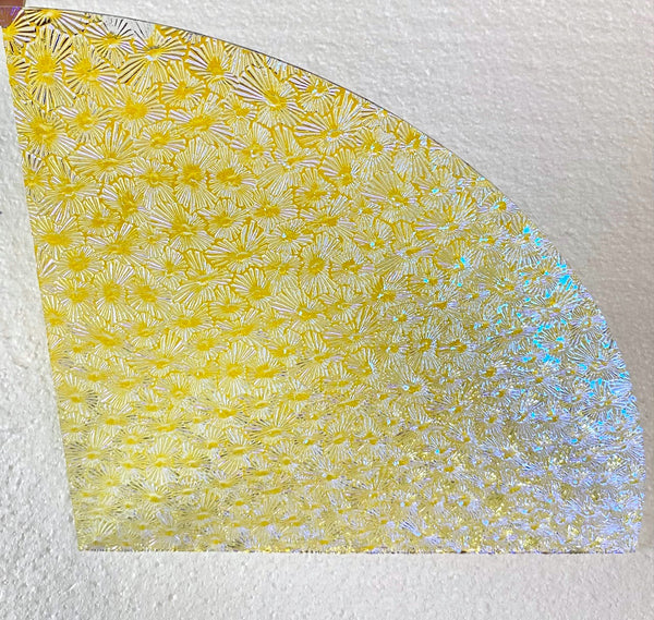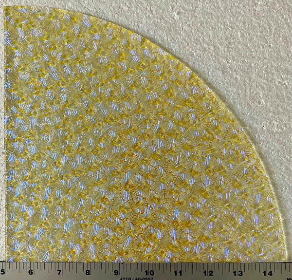 This listing is for a beautiful large thin 2mm clear Yellow Blue 90 coe 'Florentine' dichroic fusible glass with the CBS coating. Gorgeous colors on a starburst texture. Fires beautifully.